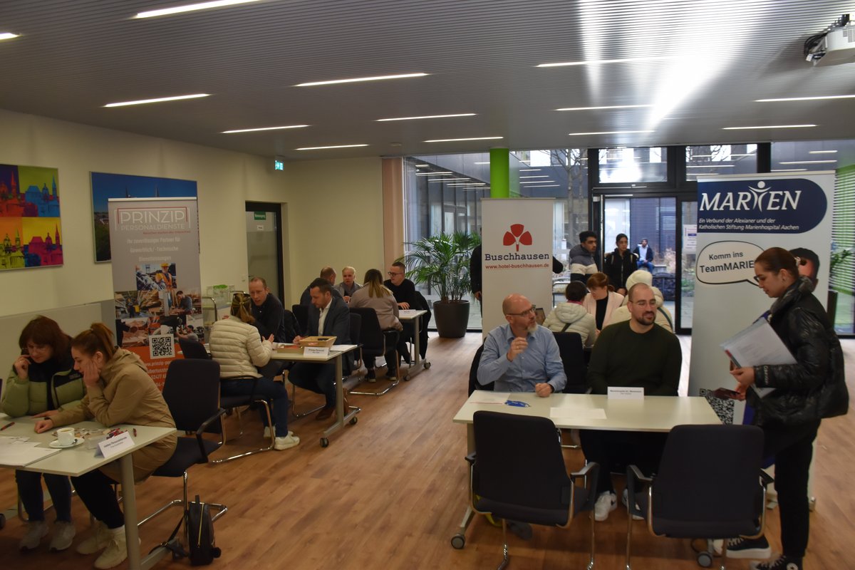 Das Job-Speed-Dating im Jobcenter StädteRegion Aachen - Geschäftsstelle in der Gut-Dämme-Straße in Aachen am Freitag, 23.02.24 bot für Arbeitssuchende und regionale Arbeitgeber aus unterschiedlichen Branchen eine gute Gelegenheit, in den direkten Austausch zu treten.