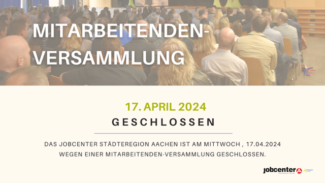 Die Geschäftsstellen des Jobcenter StädteRegion Aachen sind am Mittwoch, den 17. April 2024 aufgrund einer Mitarbeitendenversammlung geschlossen.