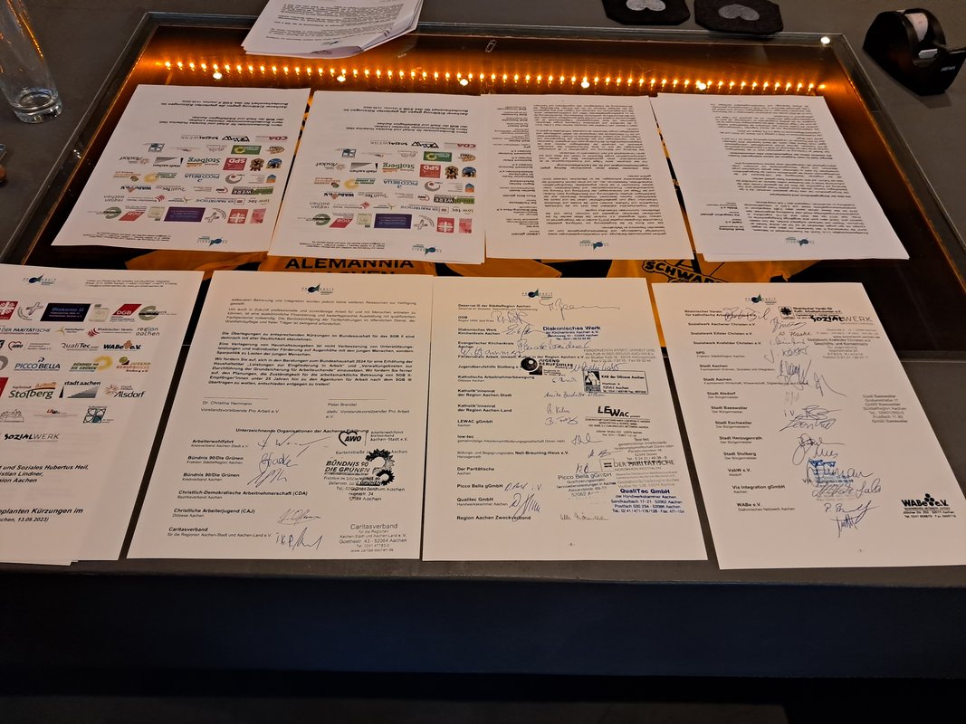 35 Institutionen haben die Vereinbarung am Mittwochabend, den 13.09.2023, im Klömpchensclub des Aachener Tivoli unterschrieben. Jobcenter-Geschäftsführer Stefan Graaf, der zu Wochenbeginn noch zwei Tage in Berlin mit verschiedenen Entscheidungsträgern sprach, informierte in einem Grußwort zur aktuellen Lage. Als Geschäftsführer der Behörde "Jobcenter" hat er bzw. das Jobcenter die Aachener Erklärung nicht unterschrieben, auf die möglichen Folgen vor Ort jedoch aufmerksam gemacht.