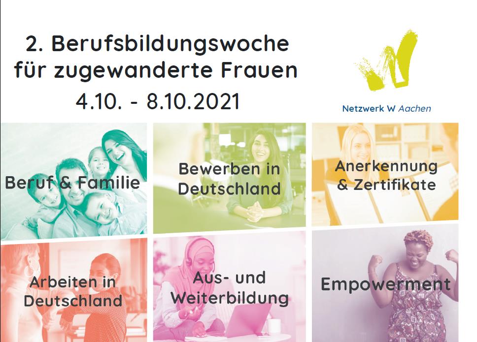 Vom 04.10.2021 bis 08.10.2021 bieten unterschiedliche Referentinnen und Referenten täglich Workshops in Präsenz und in digitalen Formaten rund um die Arbeitsmarktintegration für zugewanderte Frauen an.