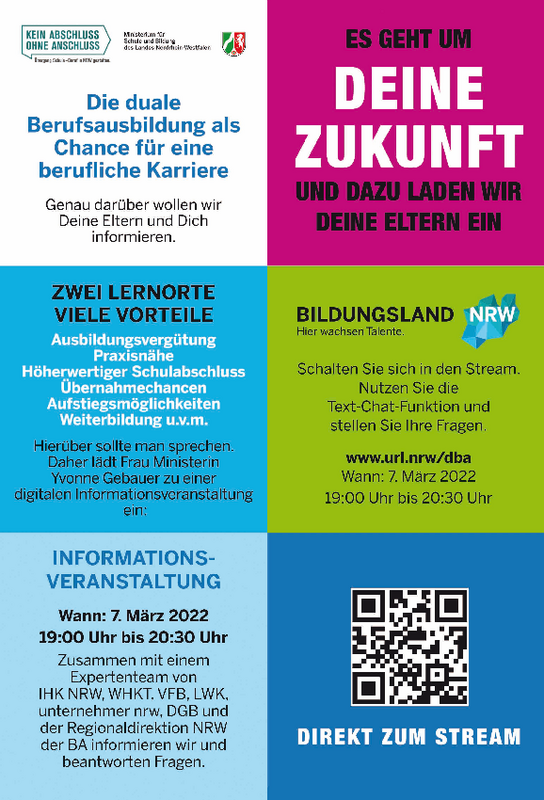 Am 07.03.2022 findet wie 2021 eine Elternveranstaltung unter dem Titel „Die duale Berufsausbildung als Chance für eine berufliche Karriere“ statt. Das Streaming-Format von 19:00 Uhr bis 20:30 Uhr wird unter Federführung des Ministeriums für Schule und Bildung des Landes NRW (MSB) und Beteiligung von Frau Ministerien Gebauer durchgeführt. Beteiligt sind hochrangige Vertreterinnen und Vertreter von Kammerorganisationen, Unternehmer NRW, dem Deutschen Gewerkschaftsbund und dem Vorsitzenden der Geschäftsführung der Regionaldirektion NRW sowie weitere Mitarbeiterinnen und Mitarbeiter der Bundeagentur für Arbeit.