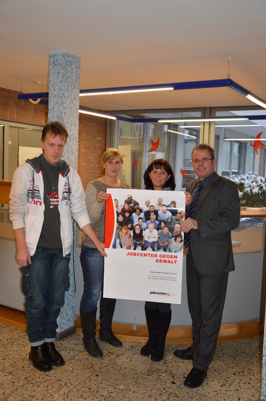 Aufgrund einer Initiative der Geschäftsführung und des Personalrats des Jobcenters wurde heute die gemeinsam entwickelte Plakataktion „Jobcenter gegen Gewalt“ vorgestellt. Als äußeres Zeichen für gegenseitigen Respekt und gegen jegliche Art von Gewalt, repräsentiert es die Werte, für die alle Beteiligten stehen.