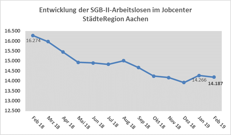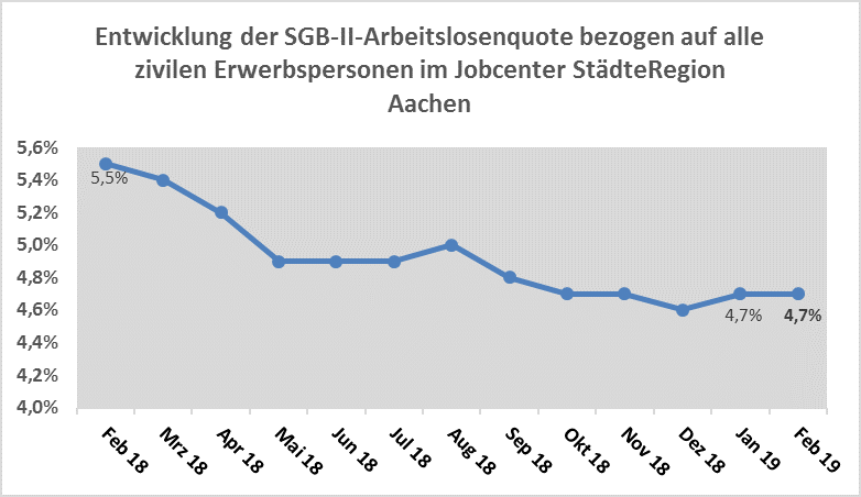 Ende Februar 2019 waren im Jobcenter der StädteRegion Aachen 14.187 Personen arbeitslos gemeldet. Dies waren 79 Arbeitslose weniger als im Vormonat. Gegenüber Februar 2018 ist die Zahl der Arbeitslosen um insgesamt 2.087 Personen (bzw. -12,8 %) gesunken. Die SGB-II-Arbeitslosenquote blieb unverändert und lag im Februar wie im Vormonat bei 4,7 %. Im Vergleich dazu lag die Arbeitslosenquote im Vorjahresmonat bei 5,5 %.