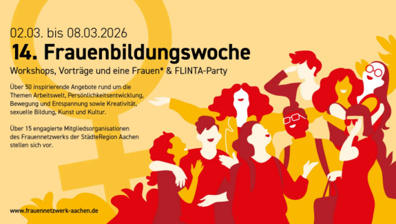 | Die 14. Frauenbildungswoche vom 02.03.2026 bis zum 08.03.2026 bietet viele Workshops, Vorträge und eine Frauen* und FLINTA-Party.