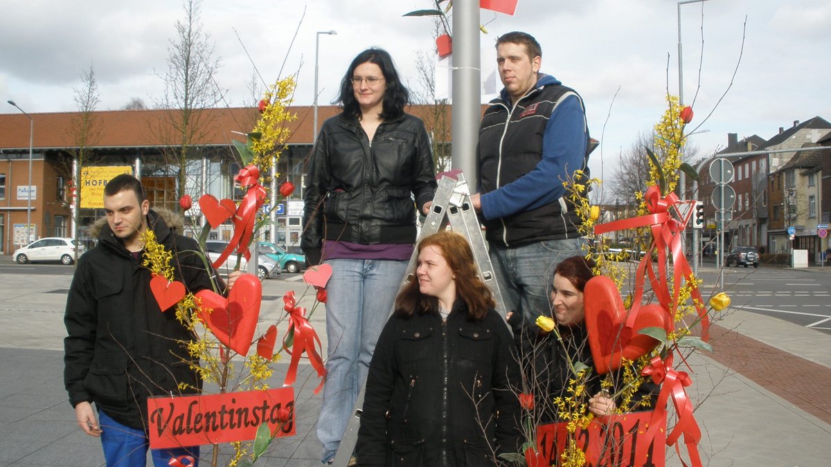 Mit viel Kreativität, Ideen zur Gestaltung ihres eigenen Lebensumfeldes am Valentinstag und Einsatzbereitschaft gingen die Jungendlichen unter Anleitung von Sabine Bußmann, Anleiterin des Kreativprojektes, an die Arbeit und fertigten die verschiedenen Dekorationsstücke. Diese wurden bereits am Sonntag an Laternen vor den Geschäften installiert, um am Valentinstag bewundert zu werden. „Die Jugendlichen leisteten damit einen Beitrag zur Stadtverschönerung“, betont Bußmann. „Außerdem erinnerten sie den Ein oder Anderen daran, seiner oder seinem Liebsten noch schnell eine Aufmerksamkeit zu besorgen.“