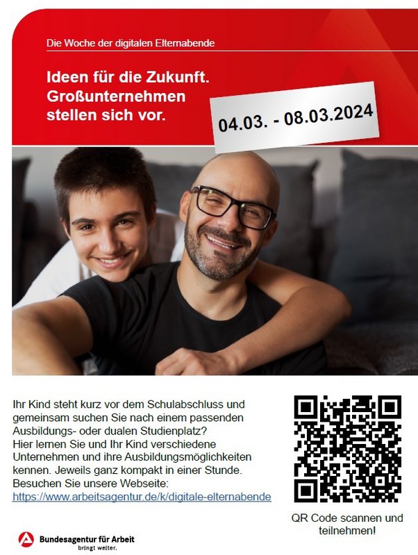 Die Bundesagentur für Arbeit veranstaltet vom 4. bis 8. März 2024 zum dritten Mal eine Woche der digitalen Elternabende. Hier wird Ihnen als Eltern und Ihren Kindern die Möglichkeit geboten, verschiedene Unternehmen mit deren Ausbildungsmöglichkeiten in einer kompakten Stunde hautnah kennenzulernen.