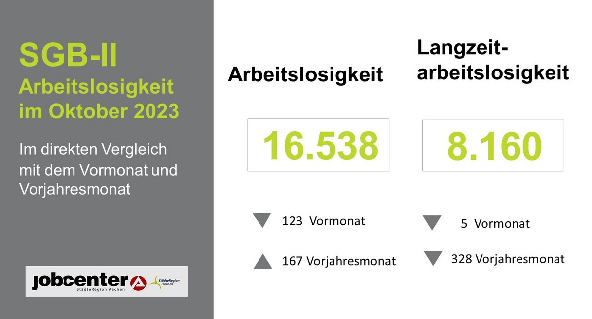 Ende Oktober 2023 waren im Jobcenter StädteRegion Aachen 16.538 Personen arbeitslos gemeldet. Dies waren 123 Arbeitslose weniger als im Vormonat. Gegenüber Oktober 2022 ist die Zahl der Arbeitslosen um insgesamt 167 Personen (bzw. 1 %) gestiegen.